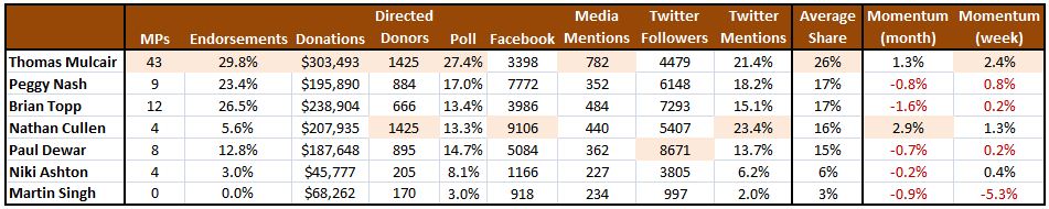 The “average share” column is simply an average of each candidate’s share of the pie on these 9 indicators. It’s by no means intended to be a predictor of first ballot support but, that said, I wouldn’t be shocked to see numbers similar to this on Saturday: