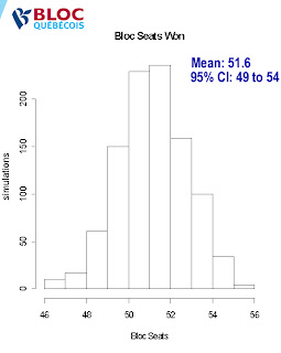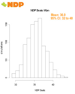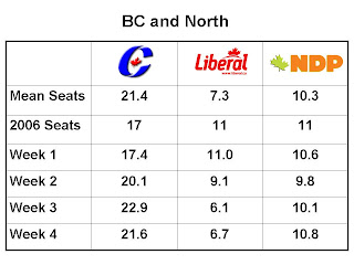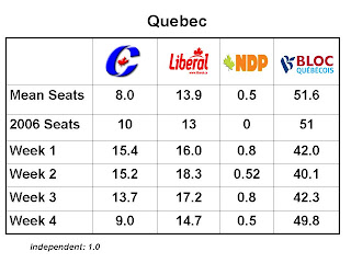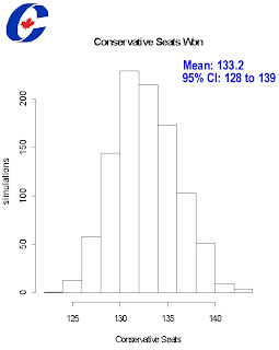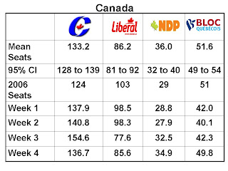 If you’re curious, just using the final polling numbers produces a very similar result of CPC 131.6, Lib 86.7, Bloc 52.5, NDP 36.2.