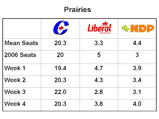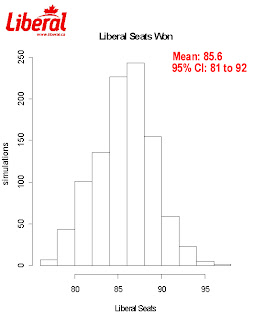 Which finally brings us to the Calgary Grit Simulation Projections. The methodology can be found here. The short version of it is that I’ve taken regional breaks on all publicly released opinion polls and plugged them into a model that takes into account results from the past 2 elections, by elections, and incumbency effects. Then, based on the variance of the polls and the variance in this model (found using ’04 data to project ’06), I simulate 1000 elections – this way, it recognizes that a projected 40% to 39% win in a riding only means the party on top has a better chance of winning the seat…they won’t neccesarily take it.