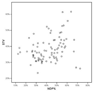 1. The margin of victory in a riding had little impact on support for STV. One of the main reasons I decided to do this little exercise was to test the hypothesis that voters in ridings that are routinely blow outs would be more eager for electoral reform, to make their vote “count”. But that was not the case, with a non-existant -0.003 correlation between the general election margin of victory and support for STV in each riding.