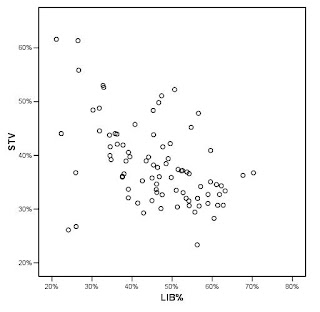 3. Voting behaviours are closely linked to STV support. There is a strong correlation between support for the Green Party in a riding and that riding’s overall support for STV (r = 0.602). To a lesser extent, ridings voting NDP tend to be more STV-friendly (r = 0.314), while ridings voting Liberal prefer FPTP (r = -0.472).