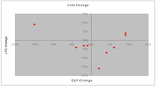 If you prefer, we can use the change in provincial vote to predict the change in federal vote…at least that should control some of the secondary factors, right?