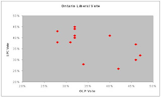 For the more numerically inclined among you, there’s a -0.583 correlation between the two variables – in normal speak, that means when the provincial Liberals do well, the federal Liberals don’t. And, even though I used 40 years of data, it’s been that way since the dawn of time (or, at least, the dawn of confederation).