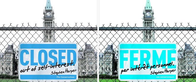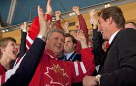 So how did Harper spend his prorogation vacation? With a trip to the Olympics! Sure, he never got that much speculated about “Olympic boost”, but at least he had better seats for the gold medal game than poor Jack Layton who had to push old ladies out of the way to be seen by the TV cameras: