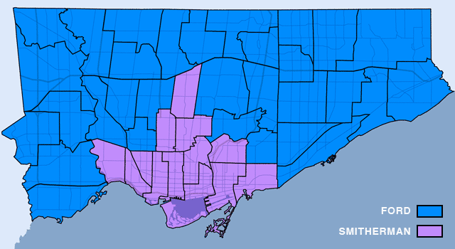 The City of Toronto has released the poll-by-poll election night numbers and the result is no surprise – if you live in pre-amalgamation Toronto or on a subway line, you likely voted for Smitherman. If you’re a surburban type who drives a Ford, you likely voted Ford.