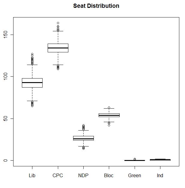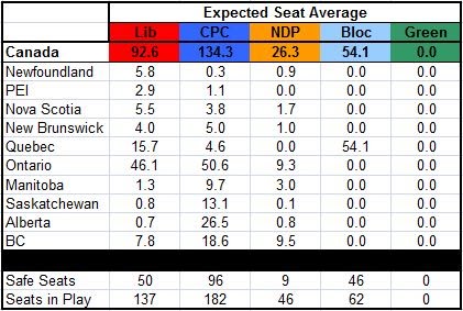 Now, as then, we’re on a crash course for a Tory minority, with only a 0.1% chance of a Liberal government and a 0.3% chance of a Harper majority.