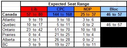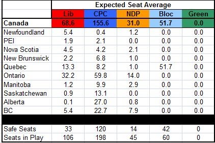 Then, as now, Harper’s gains have come almost exclusively in Ontario. The lower end of that 95% confidence interval for Ontario is 51 seats – that’s the toal he got last election, and he could gain up to 19 more. In every other province, Harper’s expect seat total is within 1 or 2 of his total last election.