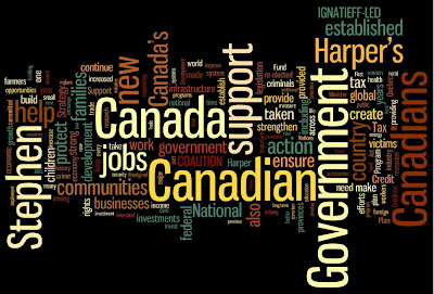 The most interesting stat is the use of the party leader names. The Conservative platform mentions Harper 102 times and Ignatieff 46 times. The Liberal platform mentions Harper 69 times and Ignatieff 5 times. Neither platform mentions Jack Layton.