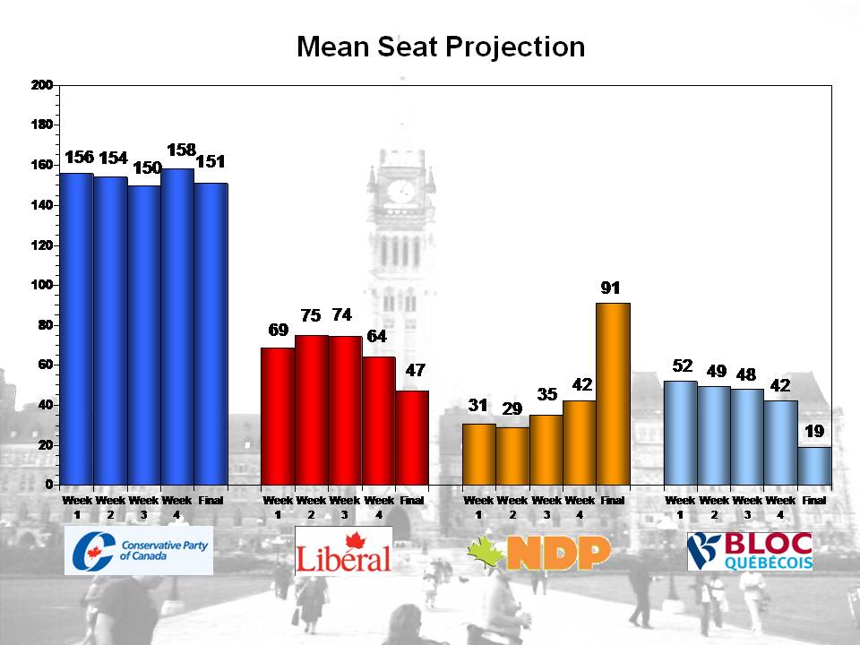 Keep in mind, the Conservatives exceeded their final poll numbers by 2-3 percentage points in 2008. Whether or not that happens again remains to be seen, but they do have the best ground game and the most incumbent candidates. Their vote also tends to be older and, I suspect, is more likely to turn out at the polls. But that’s all conjecture on my part – the exercise here is to make projections using the data on hand.