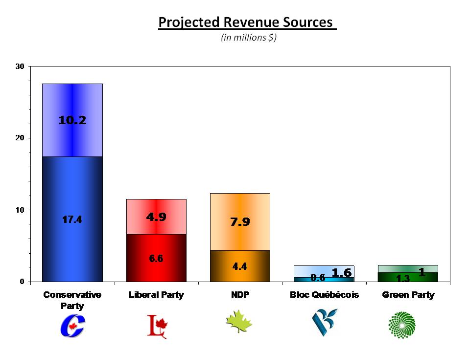 It’s hard to project fundraising dollars moving forward. I’d expect the NDP should get a boost, and I’d expect demoralized Liberal and Bloc supporters to donate less money. But, let’s assume for a moment that the parties continue to raise funds at their current levels. Here’s how their annual revenue streams would break down: