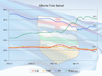 The polls all show Danielle Smith and her lovable band of bigots homophobes racists misfits up by between 7 and 10 points 2 and 10 points. It’s hard to say what that translates to in terms of seats, but the mean prediction of the 150 entries in the Great Alberta Election pool is: WR 42, PC 37, NDP 4, Lib 3, AP 1. Despite the poll numbers, over a third of all pool respondents predict a PC victory, so someone’s in for a surprise tonight – one way or the other.