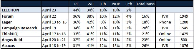 6. So how could all those polls have been wrong? Well, if you look at that table above, you’ll notice that Leger was one of the closest to the final mark, despite leaving field a week prior to the vote, before any “swing back” to the PCs was fully felt. The pollsters who overshot Wildrose support the most all used robo-diallers and online panels.