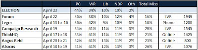 As most have commented, Forum’s Sunday afternoon poll picked up part of the late swing but, even then, to go from a 2-point Wildrose lead and 10-point PC win is under 24 hours is shocking. It wasn’t just a case of last second “strategic voting”, since most polls in the final week correctly pegged Liberal and NDP support levels.